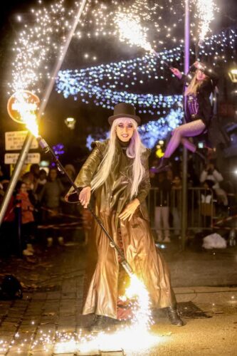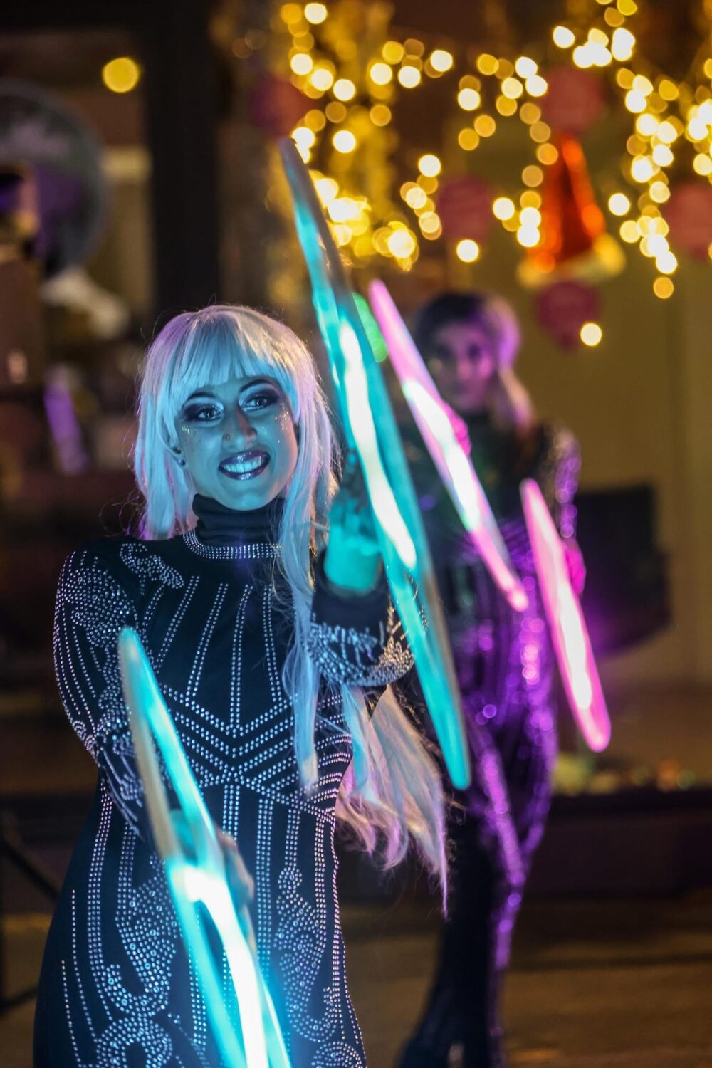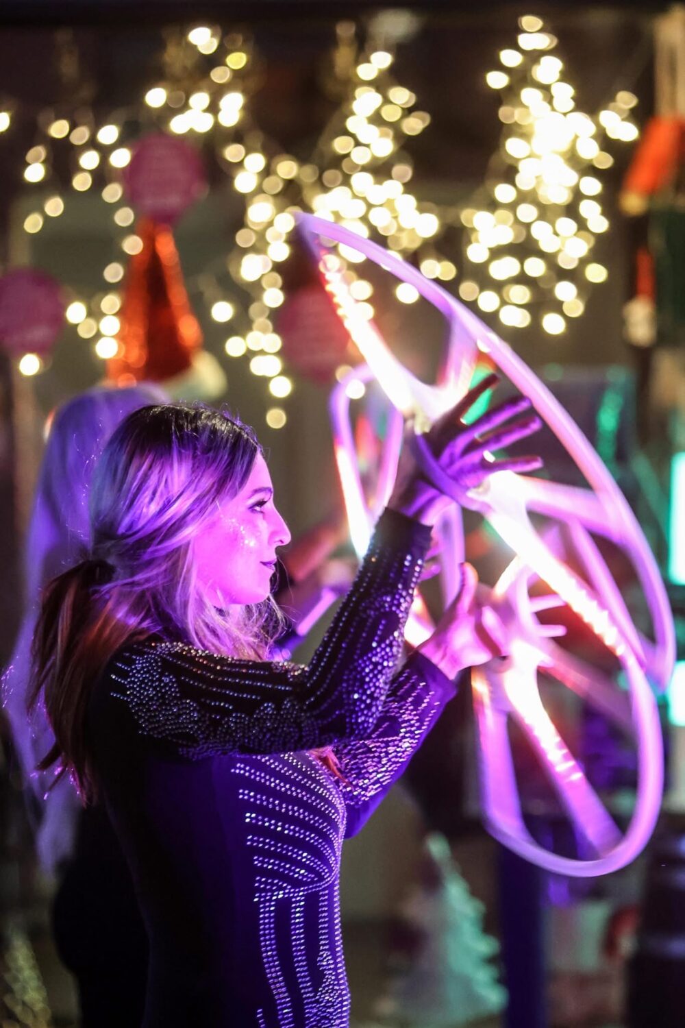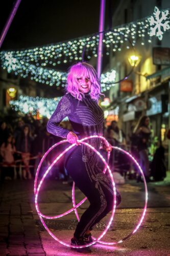 Hula Hoops LED, Pixel Poï, staff pyro, éventails lumineux, tissu et cerceau aérien composent ce ballet de lumières et d’étincelles.