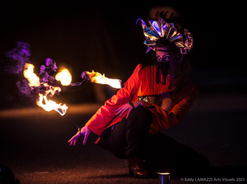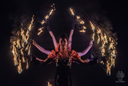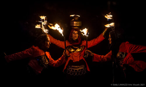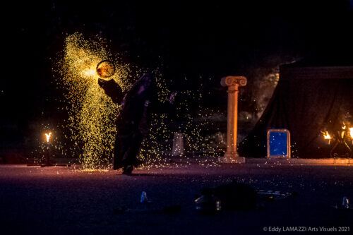 Dans ce ballet de flammes et d’étincelles inspiré de la mythologie Égyptienne, 4 personnages mystérieux jouent avec leurs objets enflammés et découvrent le pouvoir rassembleur du feu originel.